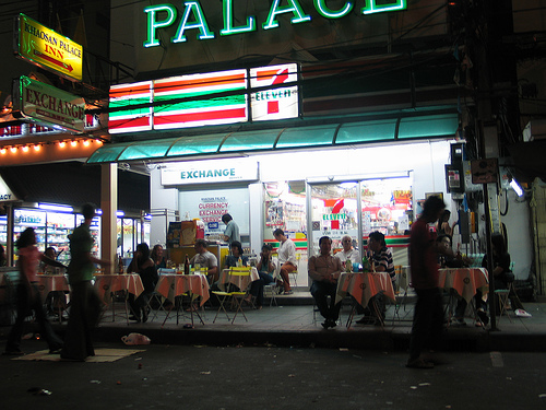 Saya pun berjalan menyusuri keramaian Khao san Road. Kiri kanan depan belakang pemandangan nyaris seragam. Para wisatawan bule berbaur dengan para pedagang kaki lima lokal yang menawarkan aneka makanan minuman dan souvenir. Tidak terlalu jauh berjalan, tampaklah sebuah minimarket yang sudah sangat saya kenal: 7 Eleven. Setahu jaringan convenience store global yang kalau di Indonesia mirip Alfamart atau Indomaret ini juga melayani keperluan telekomunikasi seluler. Melayani penjualan kartu perdana mapun isi ulang alias top up.