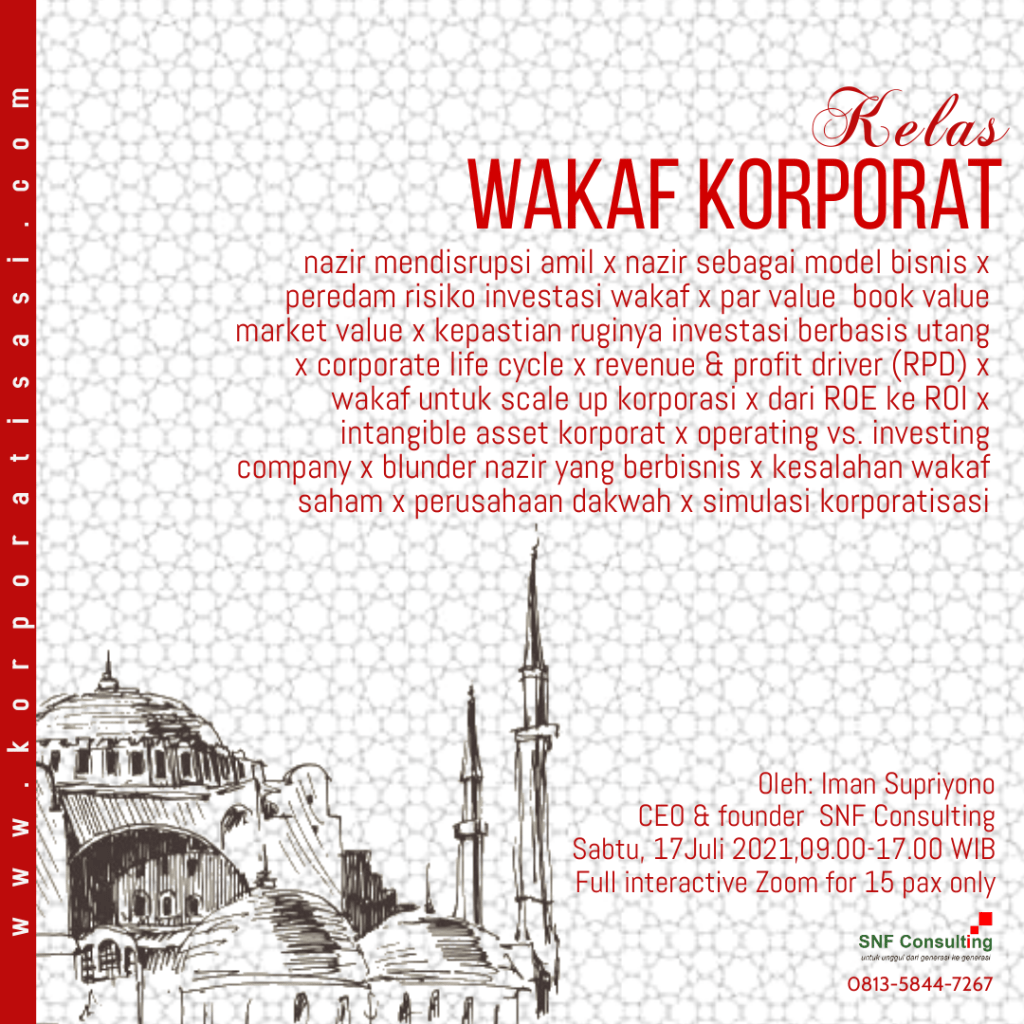 - Begitulah enam tonggak luar biasa sebuah lembaga nazir wakaf. Tapi apa yang disimulasikan di atas baru bisa berjalan jika pengelolaannya bermodel wakaf korporat. Paling tidak ada empat prinsip dasar wakaf korporat. Prinsip pertama, dana wakaf hanya boleh diinvestasikan pada korporasi yang telah mencapai tahap scale up dalam corporate life cycle (CLC) untuk tumbuhnya perusahaan dakwah. Dengan demikian dana wakaf akan aman karena sudah ada peredam risiko sebagai pengaman investasi. Investasi pada perusahaan start up hanya boleh maksimum menggunakan 1% dari total dana wakaf. Silakan klik link-link warna biru jika Anda belum familier dengan istilah-istilah tersebut.