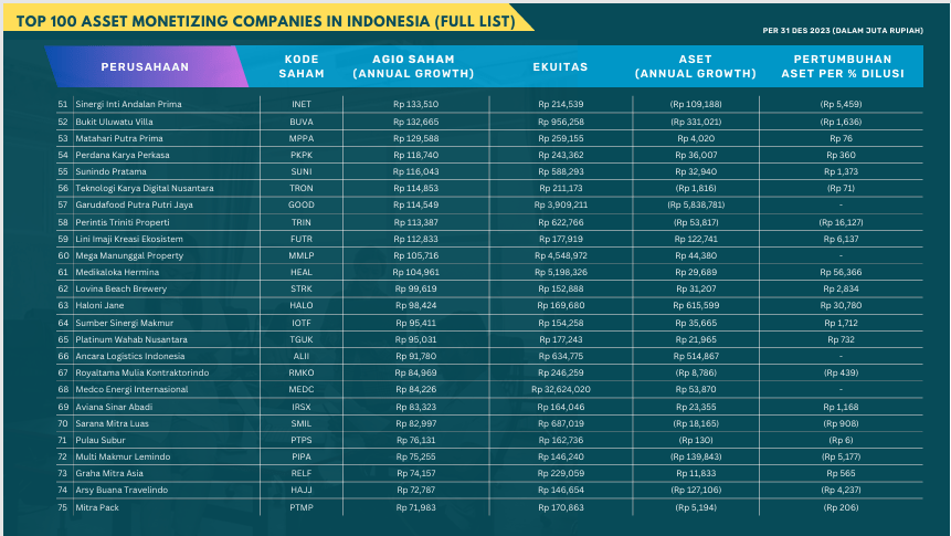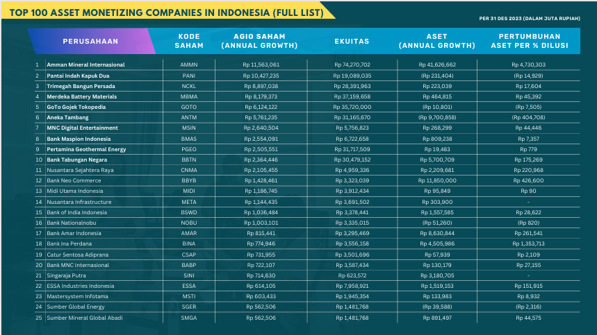 Amman meraih posisi tertinggi karena pada tahun 2023 telah menerbitkan saham baru sebesar 6.328.208.800 melalui IPO. Saham yang secara nominal seharga Rp 125 itu terjual di pasar pada harga yang jauh lebih tinggi yaitu Rp 1 695. Dengan demikian maka selisih harga sebesar Rp 1 570 menjadi agio saham.