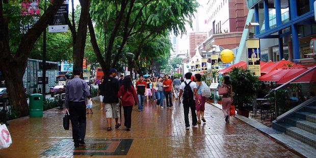 Pejalan kaki di pedestrian orchard road singapore terlindung dari laju kendaraan di jalan dengan taman dan pohon pohon besar